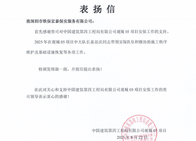 中國建筑第四工程局有限公司觀城05項目總承包工程項目部致信表揚我司鐵保宏泰深圳保安公司安保大隊長姜顯慶同志帶領的安保隊伍積極協(xié)助施工秩序維護及基礎設施恢復等各項工作,特頒發(fā)錦旗一面,并致信提出表揚。